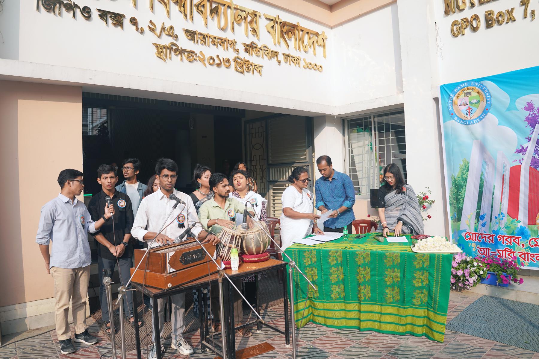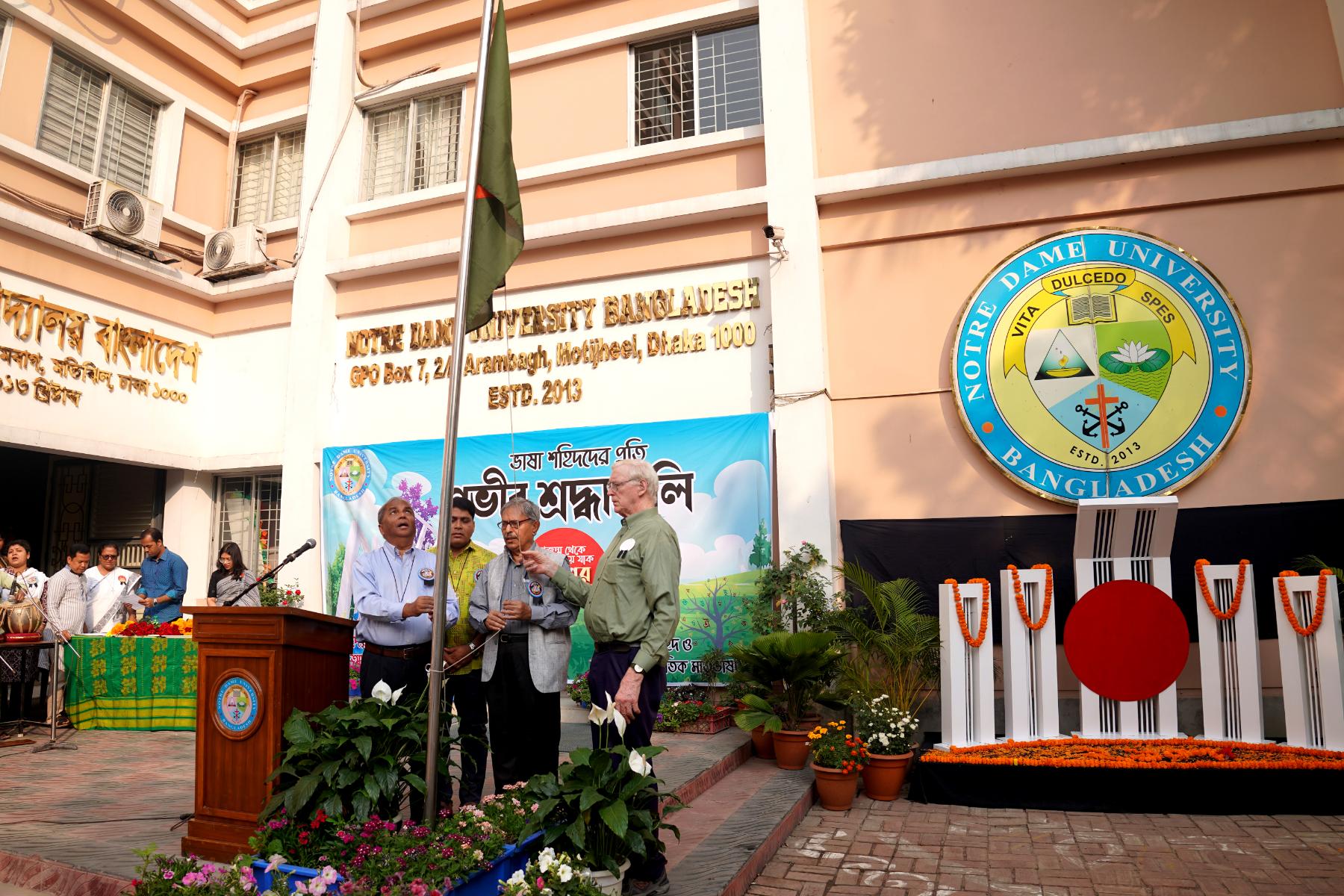 আয়োজনের শুরুতে জাতীয় পতাকা উত্তোলন করেন বিশ্ববিদ্যালয়ের উপাচার্য অধ্যাপক ড. ফাদার প্যাট্রিক ড্যানিয়েল গাফনি, সিএসসি, রেজিস্ট্রার ড. ব্রাদার সুবল লরেন্স রোজরিও, সিএসসি, ডিন অধ্যাপক ড. অলোক কুমার চক্রবর্তী এবং ডেপুটি রেজিস্ট্রার ফাদার অসীম থিওটোনিয়াস গনসালভেস, সিএসসি।